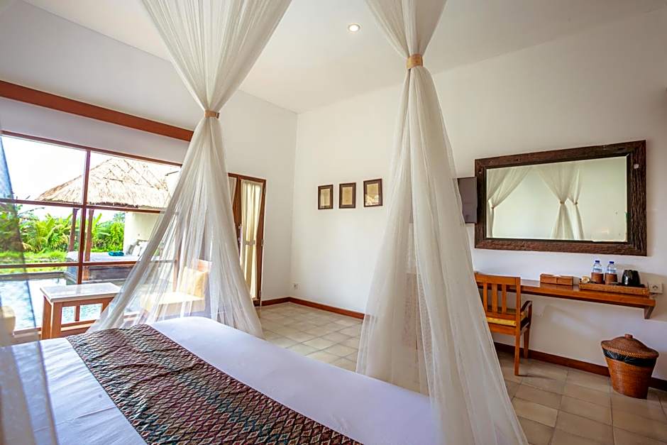 ONE BEDROOM POOL VILLA Experience total privacy in this villa with a private pool and serene rice field view. Enjoy a spacious seating area, flat screen TV, mini-bar, and electric kettle for your comfort. the private bathroom features a glass partition, shower, and bathtub. Perfect for relaxtation after a day in ubud.